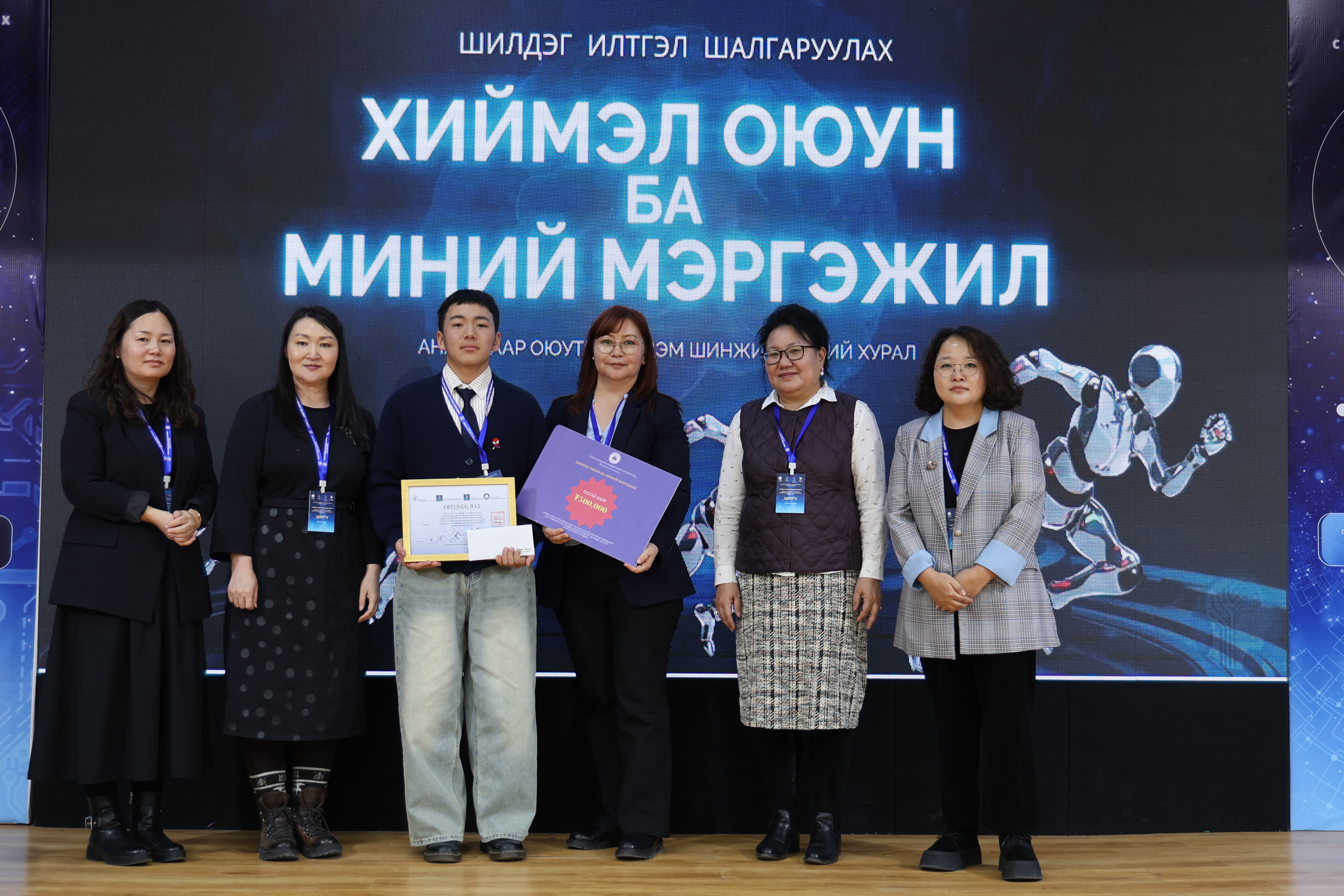 Гэр бүл, сэтгэл судлалын тэнхимийн багш А.Мөнхжингийн удирдсан тус тэнхимийн 4 дүгээр курсийн оюутан Б.Бадам, Х.Нямбаяр, Э.Ундармаа нарын "Хиймэл оюун ухааныг сэтгэл зүйн зөвлөгөөнд ашиглах боломж ба хязгаарыг судалсан нь" сэдэвт илтгэл, Эрх зүйн тэнхимийн 2 дугаар курсийн оюутан Х.Галдаваагийн " Автомат жолоодлогын эрин үе ба хууль эрх зүйн шинэчлэл" сэдэвт илтгэл тус тус тусгай байранд шалгарч өргөмжлөл, 500,000 төгрөгөөр шагнууллаа.