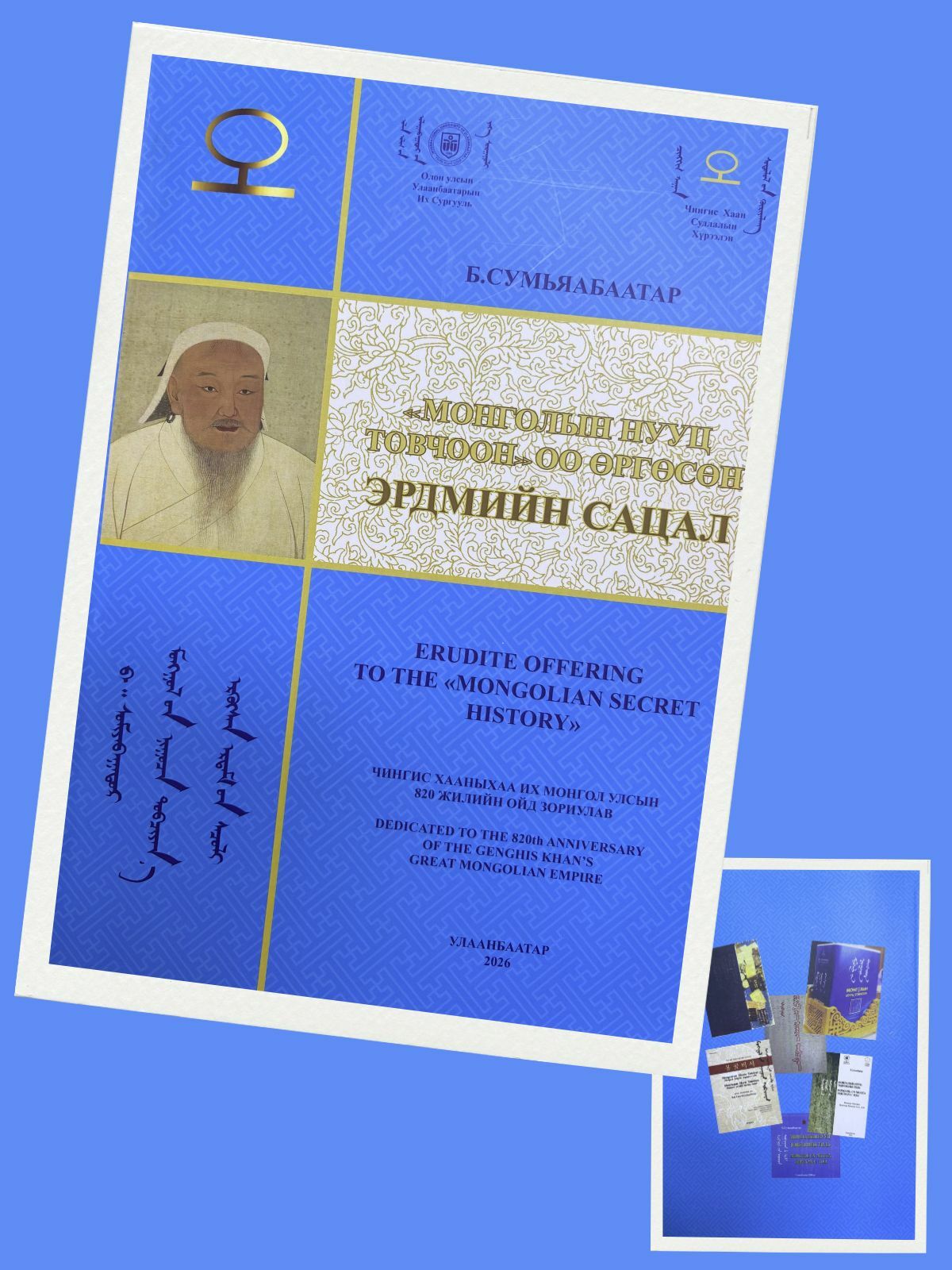 Чингис хааны Их Монгол улс байгуулагдсаны 820 жилийн ой энэ жил тохиож байна. Тус ойд зориулсан, монголоор зогсохгүй дэлхийн анхны бүтээл ОУУБИС-аас мэндлэв. “Монголын Нууц Товчооноо өргөсөн эрдмийн сацал” нэртэй эл ном (894 нүүр)-ыг Чингис хаан судлалын хүрээлэнгийн захирал, шинжлэх ухааны гавьяат зүтгэлтэн, доктор профессор Б. Сумьяабаатар бичжээ.